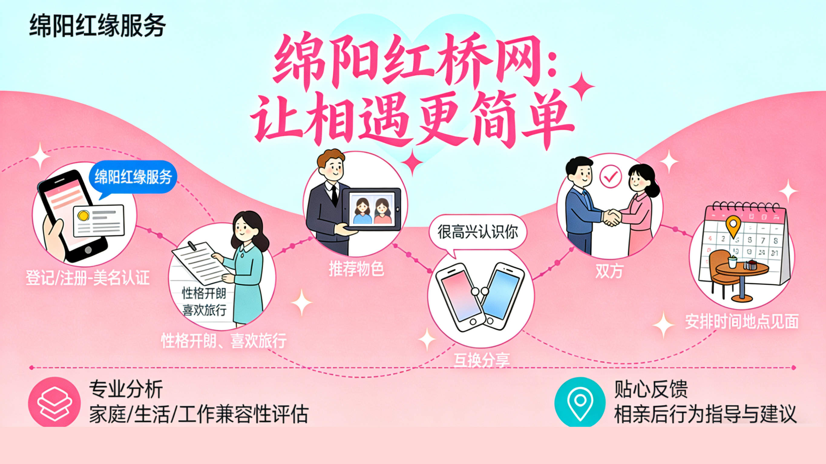 5、相亲反馈;以上为一个完成的红桥牵线流程,尽可能减少相亲次数,更容易脱单!